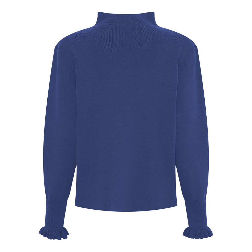 Tröjan Frigga New Pullover är en elegant och stilfull tröja med hög krage och åtsittande ärmar dekorerade med en vacker volangkant. Den är tillverkad av en bekväm bomullskvalitet med lite stretch, vilket ger en skön passform. Tröjan har ett Isay signaturmärke nertill och små sprundar på varje sida. Du kan komplettera din look genom att styla tröjan med dina höga jeans och en snygg kavaj.