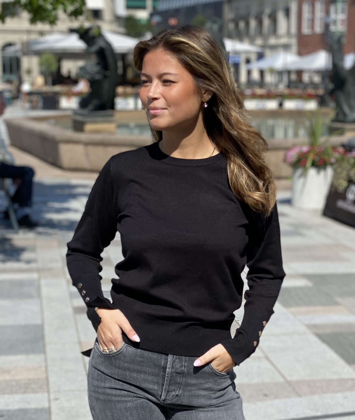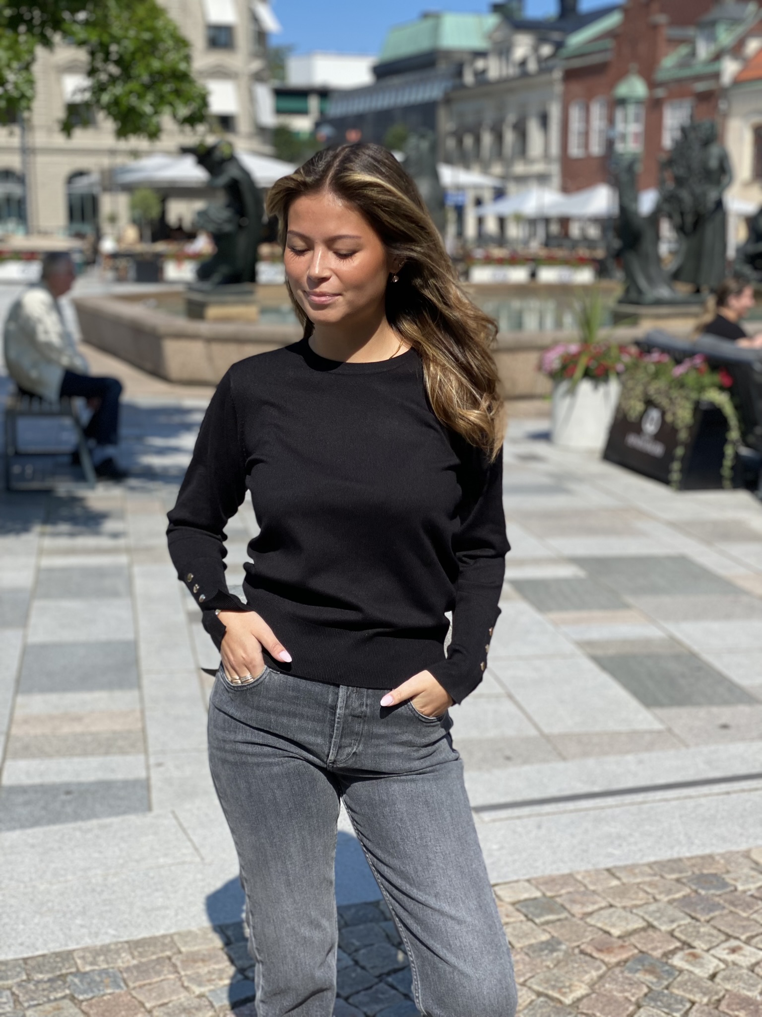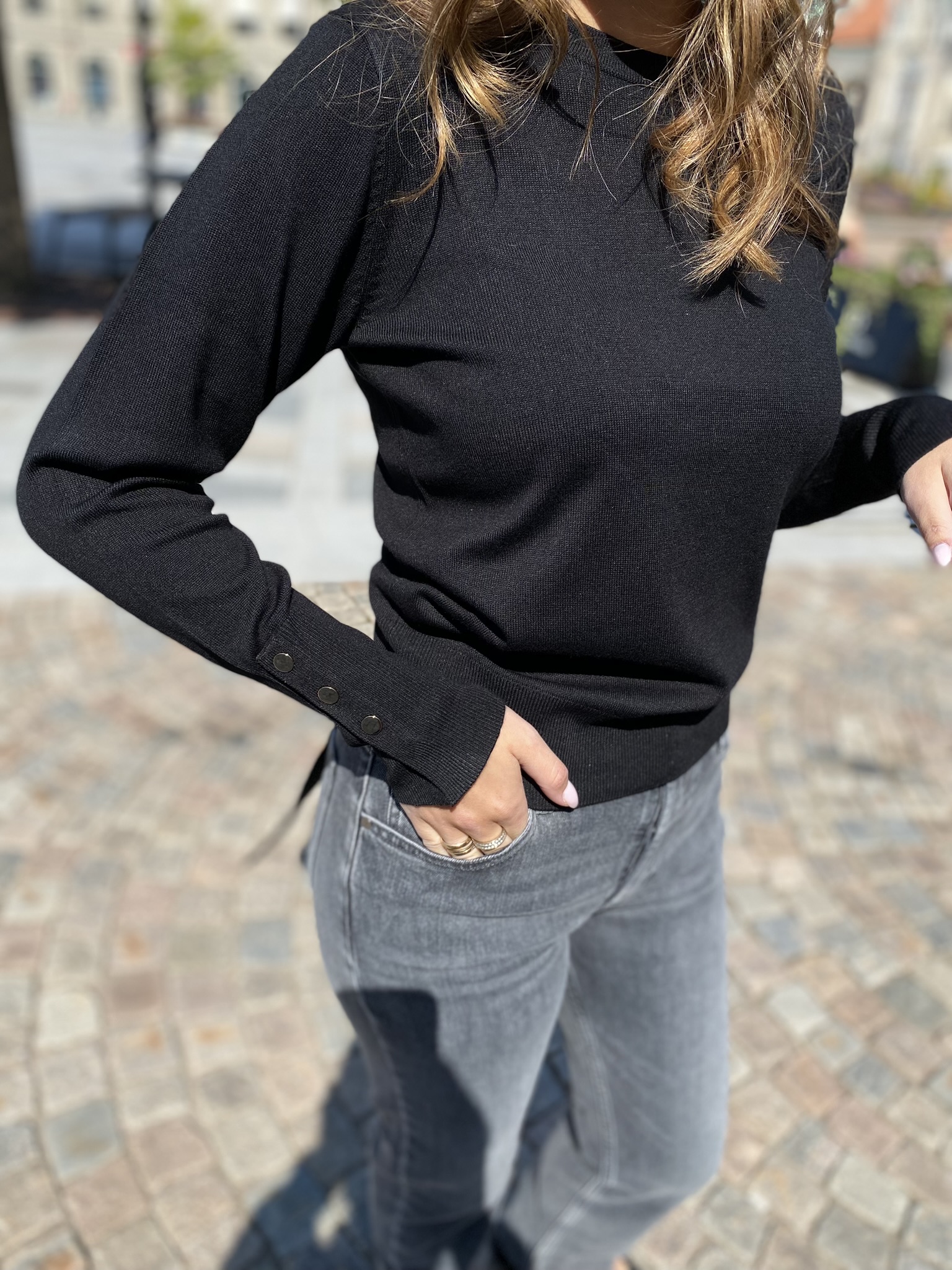 Freequent pullover i ett mjukt, finstickat material. Pullovern har en enkel siluett med en avslappnad passform, en rundad halsringning, ribbstickning samt långa ärmar med dekorativa knappar i guld.